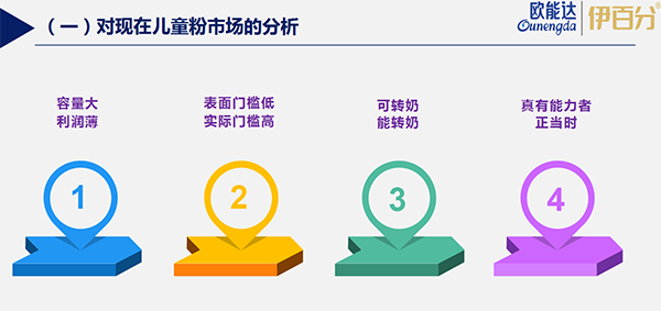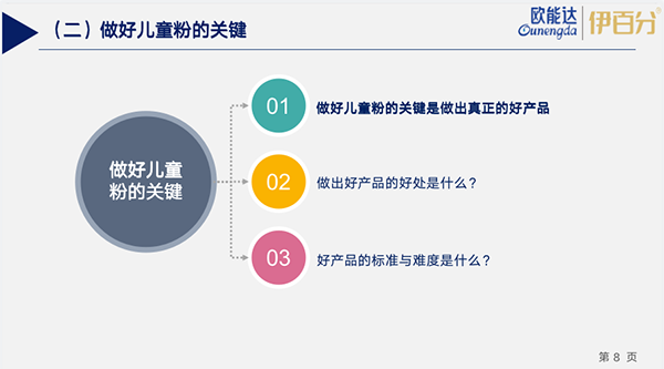 首先甘董事長對伊百分兒童粉上市一個多月以來進(jìn)行了總結(jié)分析:市場反饋方面:【伊百分】上市以來,包裝、配方、口感深受消費(fèi)者好評,回頭率非常高,合作伙伴給予的一致評價:始于顏值,終于品質(zhì),值得擁有!消費(fèi)者更是直接跟門店反饋,很多孩子喜歡,主動要喝:”媽媽,我要喝伊百分,我要長高,我要考一百分!公司銷售業(yè)績方面:從開發(fā)新客戶數(shù)量、發(fā)貨總件數(shù),單個客戶提貨次數(shù)及提貨頻率進(jìn)行了數(shù)據(jù)分析。一個地級代理商首批提貨 150 件,一個縣級代理商單次提貨伊百分兒童羊奶粉100件,單一客戶一個月內(nèi)提貨頻率高達(dá) 5次之多,同時全國非常多的終端門店每個月訂貨平均達(dá)3次以上,各項數(shù)據(jù)均表示取得了優(yōu)異的好成績,非常喜人。為我們的精英團(tuán)隊點贊!甘董事長一直對行業(yè)發(fā)展有著精準(zhǔn)的洞察和理解,這次對當(dāng)前兒童粉市場通過多方面深度調(diào)研,進(jìn)行了深刻而全面的分析,剛好他剛剛通過答辯的清華大學(xué)研究生畢業(yè)論文中對此進(jìn)行了專門研究。近年來新生兒人口下降,但4到18歲的這個年齡段人群量占了全國總?cè)丝诘?7.7%,兒童學(xué)生奶粉已成為奶粉市場的新增長點。新生代父母對于兒童學(xué)生營養(yǎng)的重視及消費(fèi)觀念的升級,進(jìn)一步催生出兒童奶粉的廣闊藍(lán)海。但通過深入分析發(fā)現(xiàn)兒童粉市場并非表面看到的這樣,真要做好非常難,兒童粉表面門檻低,實際門檻高,利潤空間極薄。兒童粉要做好的基礎(chǔ)與核心是要做出好產(chǎn)品,但做出好產(chǎn)品所需要具備的能力、經(jīng)驗,及用心投入程度等方面的難度比預(yù)想的更難。甘董事長通過兒童粉專題會非??陀^、專業(yè)、系統(tǒng)地進(jìn)行了闡述,讓企業(yè)團(tuán)隊精英更清晰地了解到兒童粉的機(jī)會、風(fēng)險,知道如何做才能真正做好兒童粉,也清晰歐能達(dá)伊百分作為高端兒童學(xué)生奶粉,作為一款精心打造的好產(chǎn)品,能給渠道商、終端、消費(fèi)者帶去什么利好!