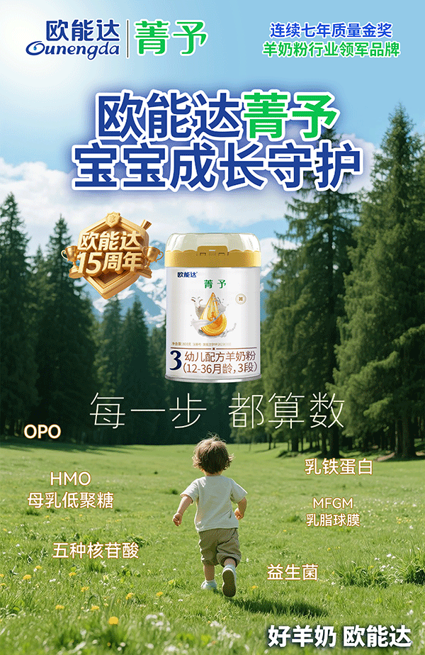 15 周年同行,歐能達(dá)菁予用滿滿營養(yǎng)(OPO、乳鐵蛋白等 ),守護(hù)寶寶成長每一步?? 連續(xù)七年質(zhì)量金獎(jiǎng)加持,好羊奶給成長穩(wěn)穩(wěn)底氣,讓小腳步邁得更有力量~