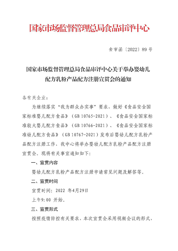 國家市場監(jiān)督管理總局食品審評中心關(guān)于舉辦嬰幼兒配方乳粉產(chǎn)品配方注冊宣貫會的通知