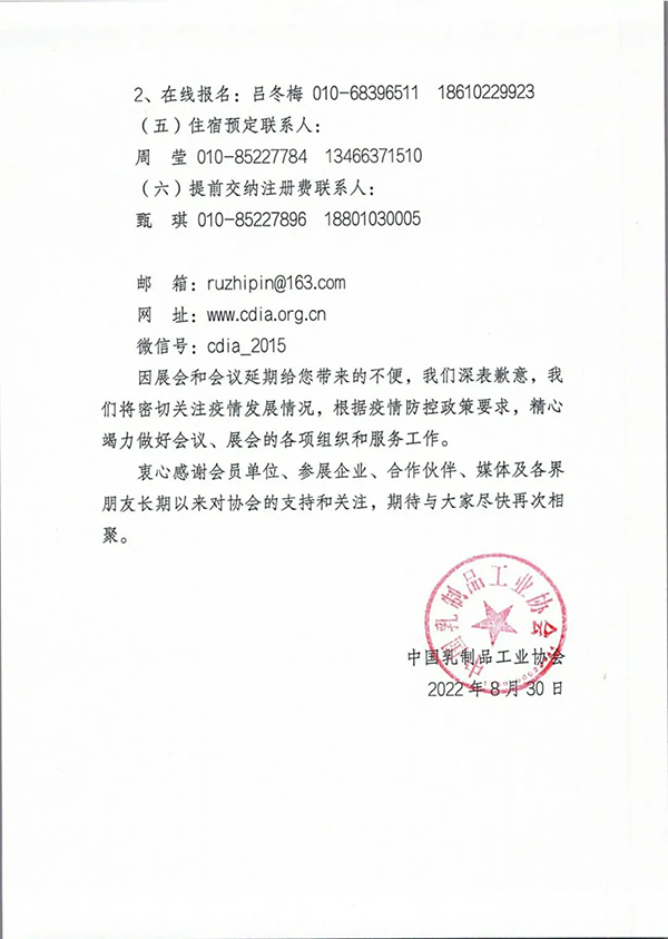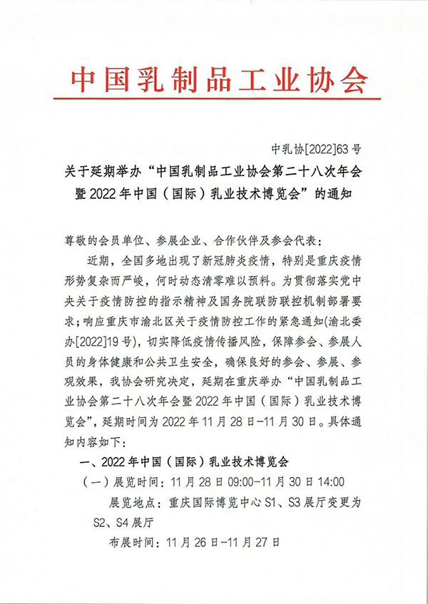 關(guān)于延期舉辦“中國乳制品工業(yè)協(xié)會第二十八次年會暨2022年中國(國際)乳業(yè)技術(shù)博覽會”的通知
