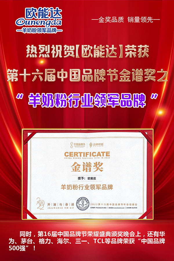 【歐能達】憑借品牌影響力、知名度、口碑及社會責(zé)任感、市場份額等斬獲金譜獎“羊奶粉行業(yè)領(lǐng)軍品牌”的榮譽稱號。